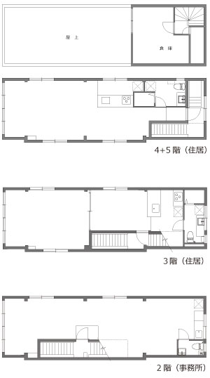 1階は店舗、2階は事務所、3階と4階はそれぞれ住居になっています。最上階の4階には5階の倉庫と屋上がもれなく付いてきます。各フロア約50平米(15坪)なので、事務所であれば5人ぐらい、住居であれば、単身〜2人といったイメージだと思います。ちなみに。